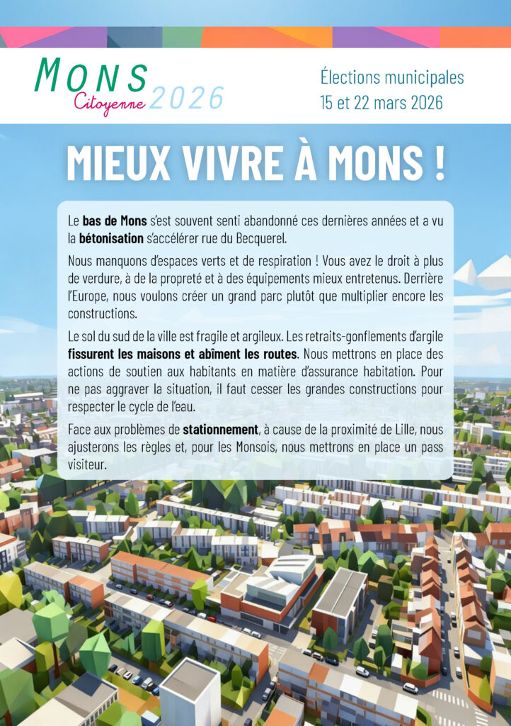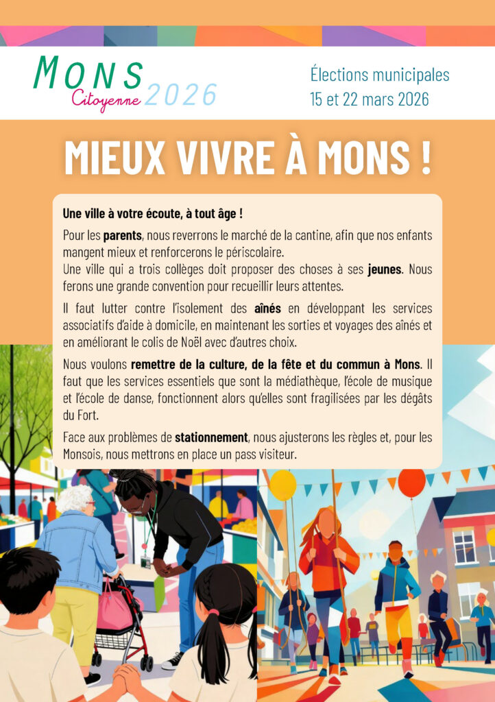 Mons Citoyenne 2026 : une ville plus solidaire et plus verte, plus vivante et plus protectrice, plus proche de vous.
